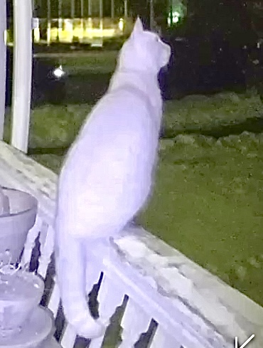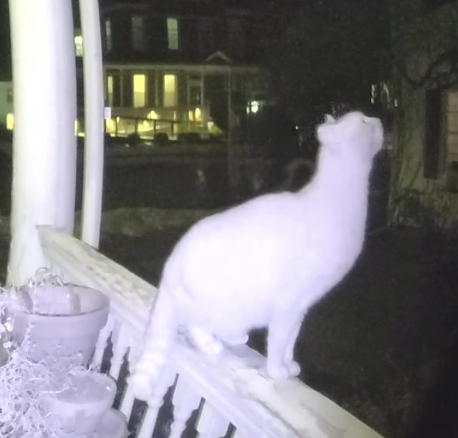 There is a cat that has begun arriving most nights, setting off the motion camera usually between the hours of 1:30am and 4:00am. It will jump up onto the same section of railing and stare at where the ivy is growing up the side of the house.