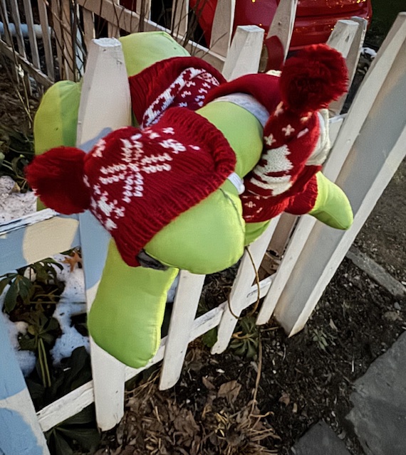 Before we got slammed with snow, while out walking the dog I did notice the neighbor’s Fence Dino had been changed into a winter sweater. It is enjoyable to catch random pops of color amidst the winter landscape.