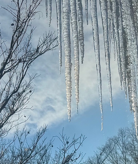 Ever lengthening icicles have formed off the soffits, stalactites generating a steady drip-drip which I cannot hear but provide a visual meditation.