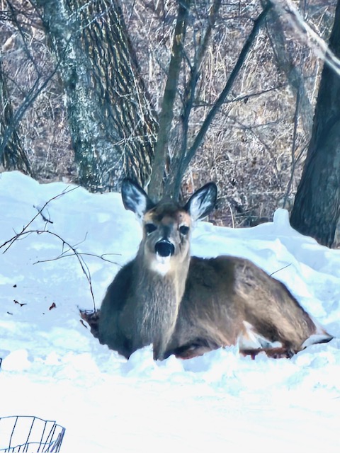 A doe has been returning repeatedly to lie in a bare patch of ground where the snow has melted. Or perhaps it is her body heat which has created this area. It’s hard to believe in not too many months there will be dancing fawns again.