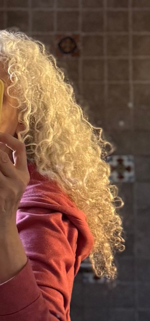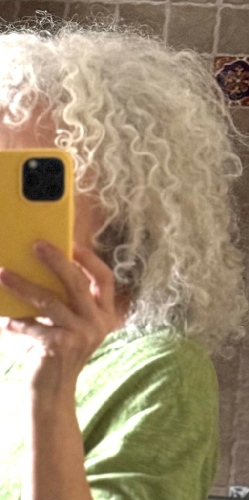 Times have changed, but my damage is still inside. When I finally got to a point to own my curls, my hair began to turn white. Then I had to deal with owning that too. Because it is so white in addition to being so…boing-y…..people (strangers) are constantly noticing and commenting on it, which my mind cannot totally wrap itself around – I always have trouble accepting or digesting when it is a compliment. My automatic response is usually “Thank-you. I grew up totally hating it.” Then I indicate their cute, straight hairdo and say “I always wished for hair like yours!” Which is true. Then we smile at each other, acknowledge that we always wish for what we don’t have, and go on our way. For some reason this often happens in the supermarket, and there is another even odder facet to these encounters. Sometimes I will be approached by a woman with the same hair as me who will compliment my hair. Then I will say “Thank you! You have the same hair as I do!” At which point they will insist that they don’t, even though they do. It is fascinating that we don’t see ourselves as others see us. It’s like hearing your own voice on a recording and saying “That’s not me.“