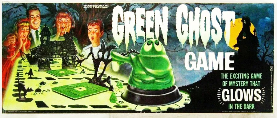 Another one we enjoyed was called “Green Ghost.” Green Ghost had a board that glowed in the dark, little green ghost playing pieces, bats, cats, bones and other spooky accoutrements, and a big ghost spinner. I cannot recall exactly how it was played, but we had fun with it and the novelty of turning off the lights to make it glow, which added an element of eeriness.