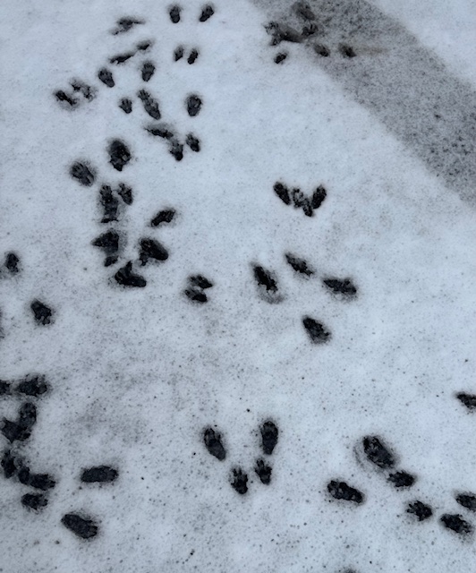 A frantic frenzy of squirrel tracks across the driveway has created a telling trail of amorous flirtations.