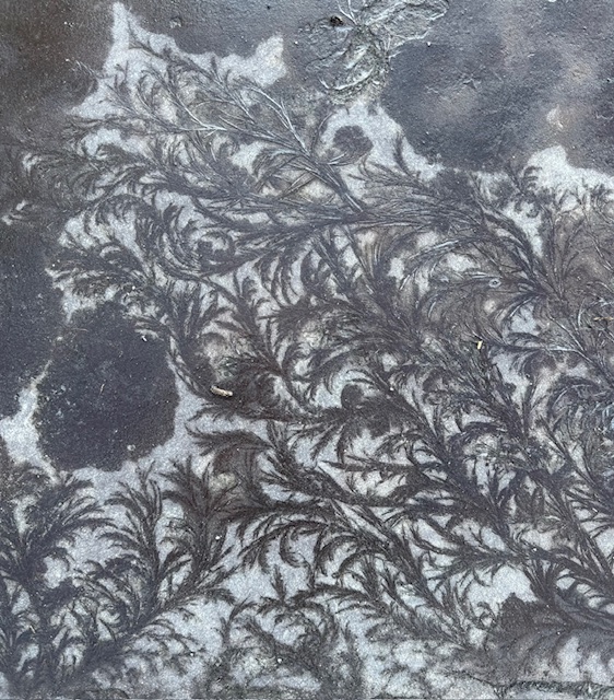 It’s March and it’s snowing (again) but we are definitely on the edge of things. Previously melted ice has left a jungle of leaf-like patterns on the bluestone, mimicking the growth and abundance of summer.