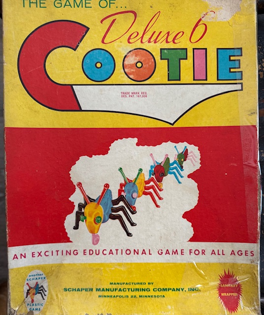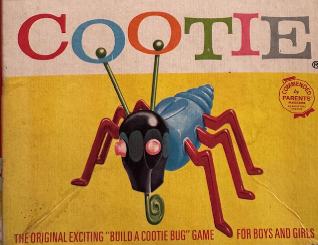 And Cootie! The old style Cootie had a significant aura of buggy creepiness to it. Subsequent versions turned the bugs into a cartoon. One problem with it was that no matter which Cootie game you had, the legs never stay on. You build your Cootie and pick it up and half the legs fall off – rather frustrating.