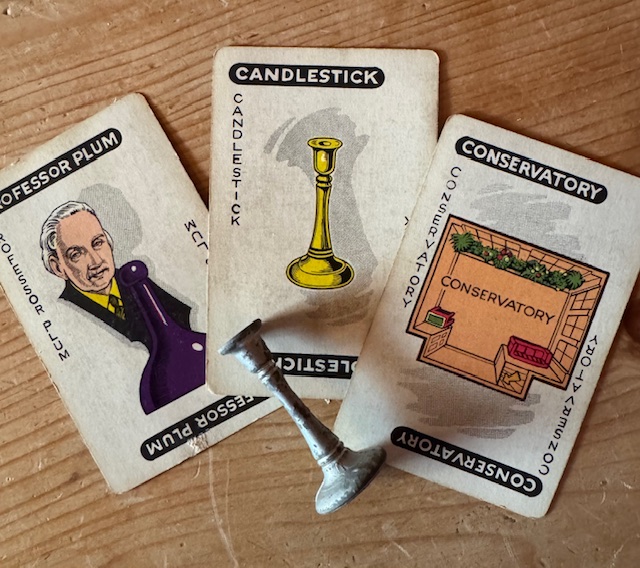 I also pulled out two different versions of Clue. I love the old time strangeness of the illustrations in the original Clue game. Miss Scarlet in the Library with the Rope! Professor Plum in the Conservatory with the Candlestick! (Yes, a metal candlestick…. possibly lead and toxic? Who knows?)