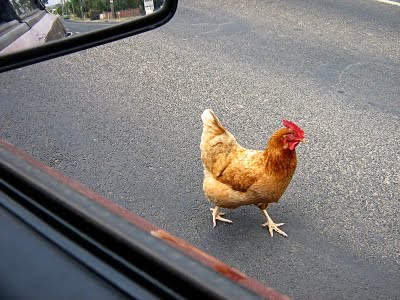 Traffic was moderate and moving steadily yesterday on the two lane road that is the middle leg of my commute home from work, when I spied a chicken on the edge of the northbound lane, waiting to cross the road. I looked again to make sure it wasn’t a wild turkey, but no, it was actually a chicken. A very anxio