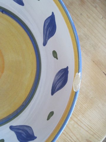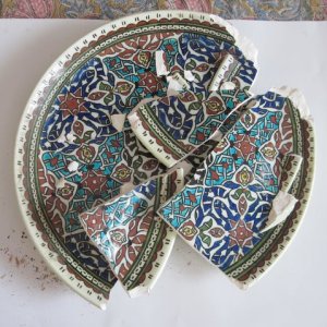 I was upstairs cleaning the bathroom and the Significant Other was downstairs, actually vacuuming one Saturday morning, when I heard the familiar “Oh, shit!” On one wall I have a number of plates from Morocco and three from Turkey. The ones from Turkey are very old to begin with, and I have had them close to thirty years. Out of the three, there is one that is my favorite. You guessed it.