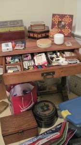So…. I got bogged down in the sewing table.  I can see now how this project is going to play out.  It will probably take me until Spring to finish what I have started regarding the clearing of clutter.   However, as an extra bonus, I did clean off the top of the table (piled with junk)  and also went through my smaller, portable oak sewing box.  I still need to clean up the floor beneath the table, which will indicate that this part is officially done.  Going through the motions of the sewing table clean-up gave me some solid reflection, which was rather satisfying.