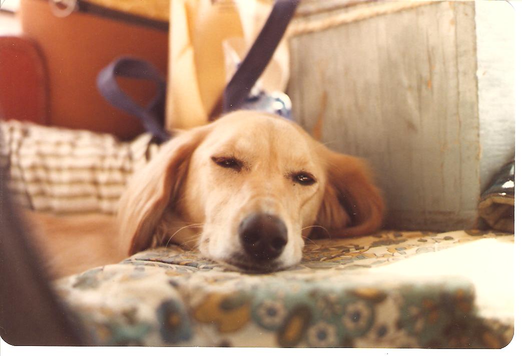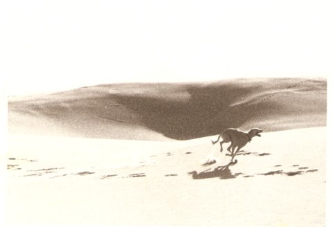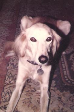 DubaA gangly, pale yellow Saluki pup of sweet disposition, with a white-tipped tail, faint white “eye-glasses” and a star upon her head, I named her “Duba” (or Dubah….I waffled on the spelling her entire life) – a bear. From the very beginning we belonged to each other. We left the north and moved to east Jerusalem, where she accompanied me on a number of strange adventures. She met Gregory Peck while filming the movie “The Omen”. She threw up on every bus we rode. She provided great solace to me when the relationship with the boyfriend inevitably blew up. And so, I eventually returned to the states with a Bedouin dress, a pierced nose, and my Duba. After a rather longish puppy-hood filled with the usual accidents and minor destruction, she grew into an obedient, sleek, long-legged beauty with intelligent eyes and a quiet, affectionate personality.