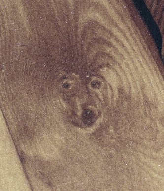 A number of years later, divorced, the kids and I moved out of that house on the hill. I was in the process of removing a dresser that had been against a wall, and there in the floor beneath the furniture I discovered a dark knot in the wood that I had never noticed before. It looked incredibly like a Saluki in the floor. I knelt down to look closely, and indeed, it was the face of Duba. I took a picture of it before we left.