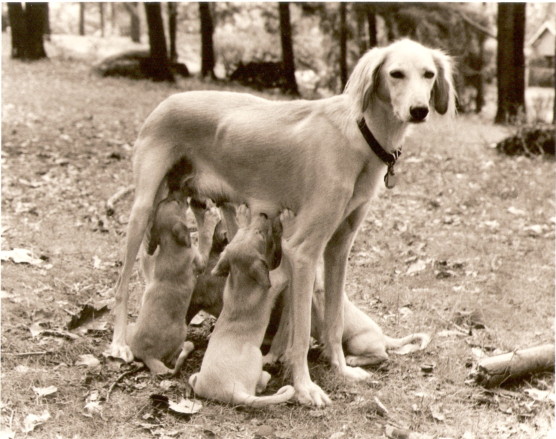 Dubah in the desertDuba had one litter of five yellow Saluki puppies. I think motherhood for her was something merely to be tolerated. She did her duty well, but I would have to say that she never really seemed especially thrilled about it and appeared glad when it was all over.