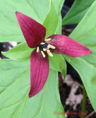The red one (Trillium erectum) supposedly has a flower that stinks like rotting meat.  Its  red color will also attract the beetles and carrion flies that will help pollinate it.  I haven’t tried to smell this one yet and am not sure I want to, especially since the yellow one has such a lovely scent.  At least it is a very small flower.  But that might explain why one of its nicknames is “Stinking Benjamin” (no explanation of why Benjamin though). It is also called birthroot, tri-flower and wake robin.  I think it is stunning.  Its small, dark flower catches the eye on the floor of the shade garden and draws your attention there.
