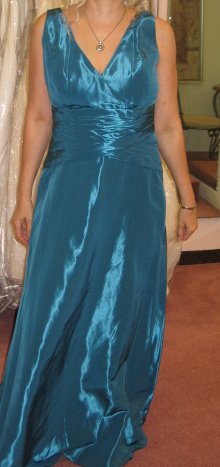Oh, no.  Noooo…no thank you.  These gowns are really not my thing.  I really am not interested in wearing a conventional Mother of the Bride dress.  It’s just not my style.  They are too expensive.  They are so Not Me.  But amidst cajoling and pleading from the family, the imploring look on Daughter #1’s face, and one rather pushy sales woman, they managed to squeeze me into a Conventional Mother of the Bride gown.  Everyone then gushed over How Beautiful it made me look, assuring that after it was altered to fit me perfectly, I would look much like the woman in the bride catalog (attractive, svelt, contemporary, young).  And so, in a moment of guilt and coercion, I agreed to it.  The sample dress I had tried on was a cocoa brown, but I chose a teal color swatch from their book, thinking that would go better with my own coloring. The gown was ordered.