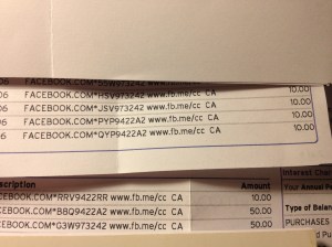 After they checked my credentials and I proved my identification, they sent me an affidavit in an email to sign and I sent that off.  Then I was instructed to cut up my card.  I have had this account for twenty-six years.  Just having to do this really pissed me off.  Now I will have to figure out which online accounts I had it connected to, make those changes and start all over again. Following that, I did an internet search to see if there was anybody else getting these bogus Facebook charges.  Indeed, these identical types of charges were showing up on the statements of other people too.