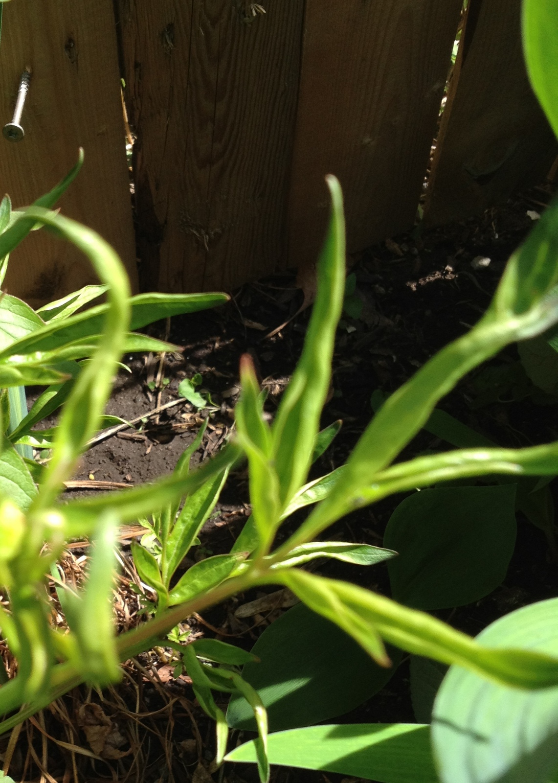 The mutant peony continued to shoot up stalks and more thin, bent, rolled-up leaves. With each new leaf I hoped it would return to normal, but they never quite unfurled.  They were oddly shaped,  each one revealing itself as a skeletal finger.  It never developed any flowers either.  I have posted a photo here, a few years after the fact.  I cannot find the photos I took of that first “Return of the Peony” but it was rather scary stuff.