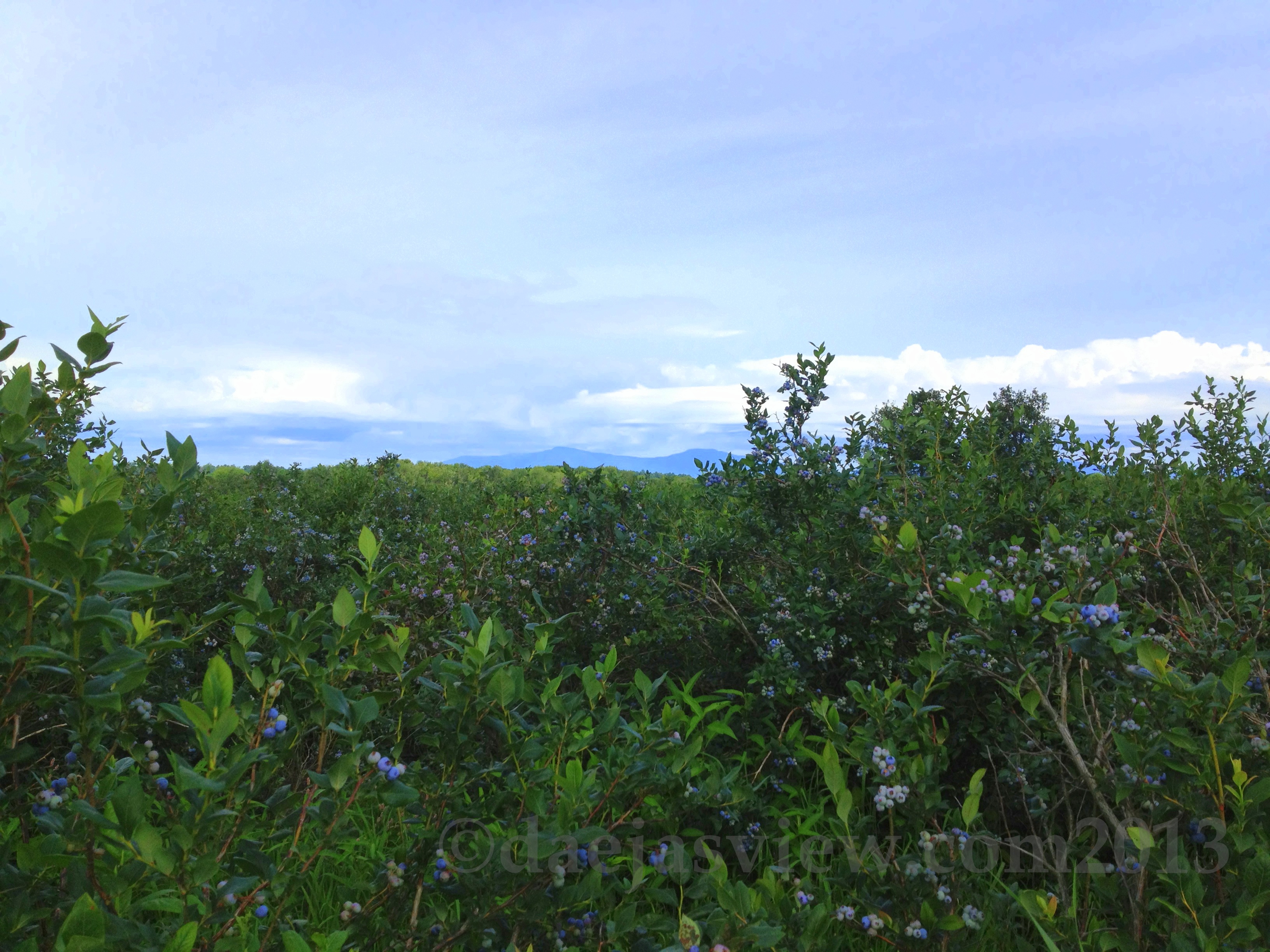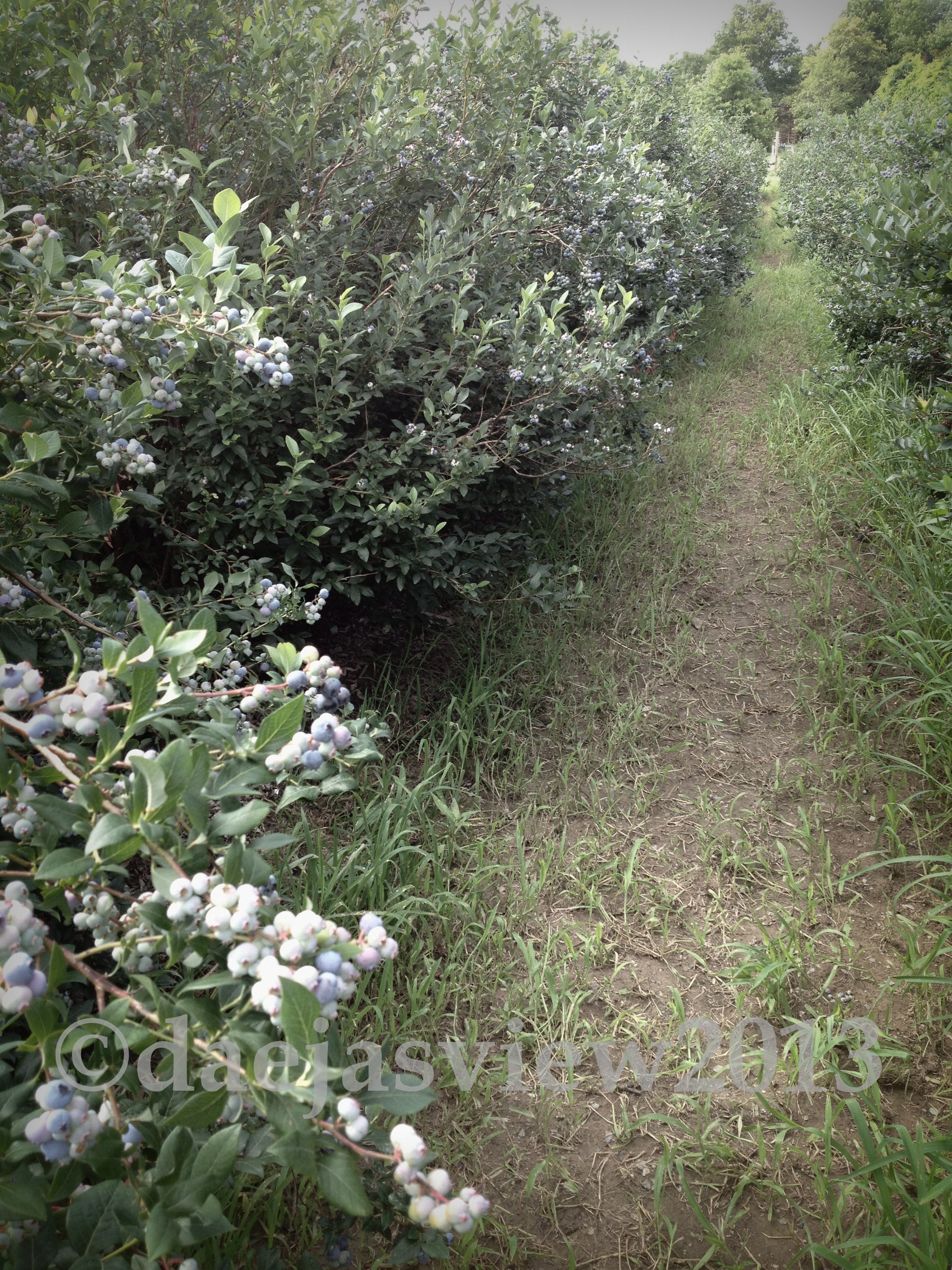 Blueberries tend to be easy, relaxing picking.  With your bucket tied to your waist, they are mostly right there for the asking, a dusty gray-blue or a shiny bruised purple, beckoning.  Gathering them this morning against the backdrop of cerulean mountains, the meditation set in.  The plumpest, most enticing berries are the ones you have to reach deeper for, the ones underneath or at the center of the bush, hidden in those darker places that have not yet been discovered, or down at the bottom where others do not want to stoop to reach.  It seems perhaps a metaphor for those things in life that require perseverance and effort in order to bring about the rewards – in this case the sweet-tart bliss which can be savored while you work your way down the rows.