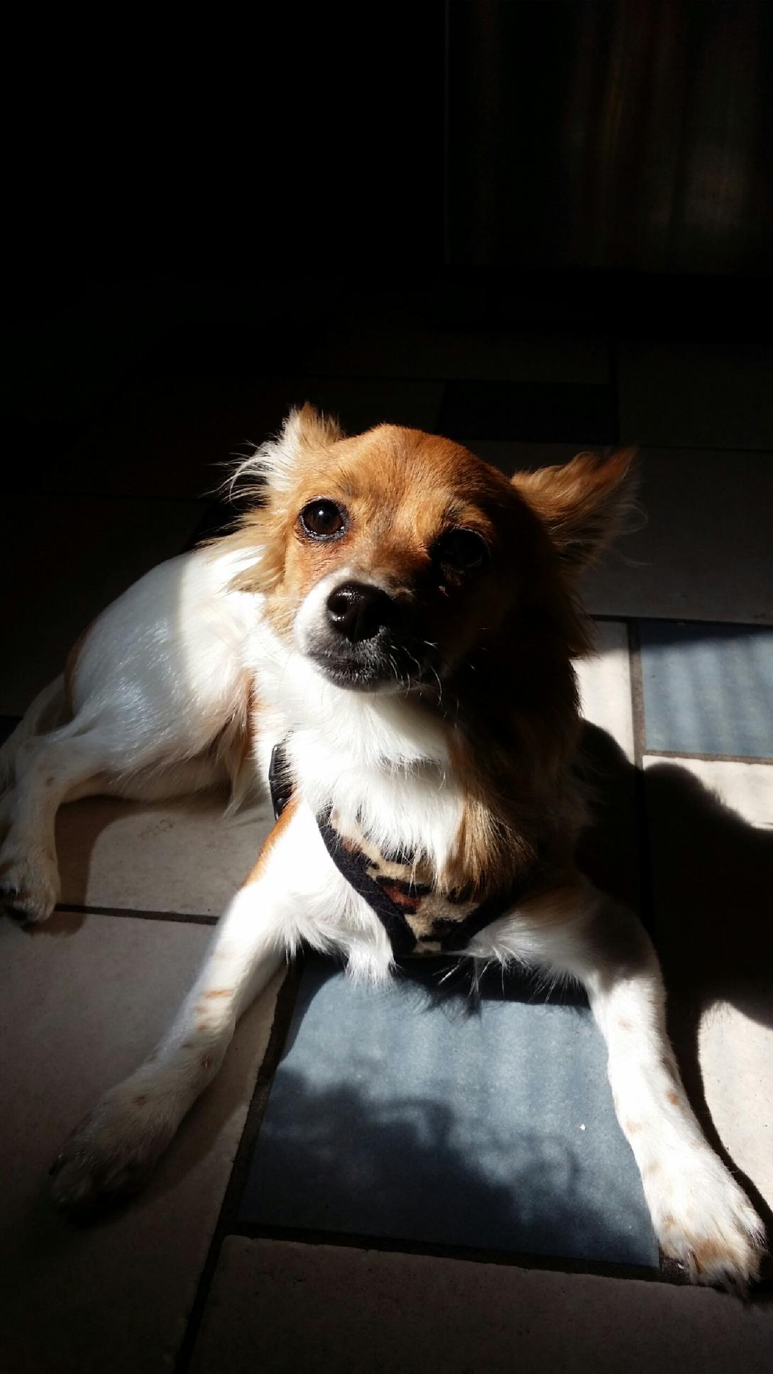 I cannot say the same thing about people though. When the S.O. comes anywhere near him, he growls, despite bribes of good food. While he is a bright, loving little dog (to me) with lots of potential (I can tell!), he is what is considered a “fearful dog” and it is clear how not having early socialization has had an impact on him. Over the last few months he has been here, he continues to avoid and back away from people, has an obvious fear of men, and when most people (besides me) try to pet him, he will lean away with discomfort while he barely tolerates it. He doesn’t show his teeth or bite…but he often growls in fear. This does not bode well for a service dog, although the jury is not out on this yet. As the S.O. so aptly noted, Rudi has “worried eyes”.