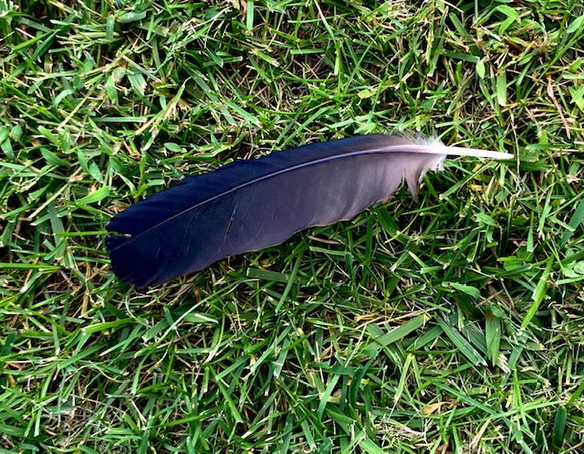 Sometimes I just sit on my porch watching them at their daily arrival. I get the distinct feeling that as I am watching them, they are also watching me. When I am walking the dog beneath the tree, I know they are checking me out. Every morning I find the grass and street adorned with white spatters and many glossy blue-black feathers. A few times I have left them some scattered dry dog food, although I don’t know if my neighbors would appreciate that, so I haven’t made a habit of it. But we are aware of each other’s presence. Sometimes they land in the trees behind the house and yell at you. They don’t like the sound of motors or machinery – the sound of a saw, lawn mower or the neighbor’s compressor sets them off complaining. Every once in a while if a hawk arrives they will keep their distance until it moves off, but I’ve also seen them give a juvenile hawk a hard time.