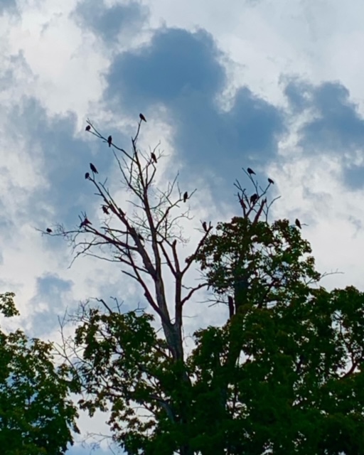 Throughout the day, the highest peak of the tree hosts a number of fleeting visitors. Without binoculars I can only tell that the day birds are smaller than the crows, perhaps seven or eight starlings who gather for brief moments and then fly off, return and then take to the air again. Compared to the crows, I call them “the lesser birds”. Sometimes a hawk – usually a red tail – will sporadically alight at the very top point. When a hawk is there – not for very long – everyone else pretty much disappears. In the late afternoon, the crows begin to arrive from wherever their daytime business occurred, one or two at a time, zooming in from points west. And the cacophony begins.