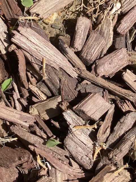 Mantis nymphs scattering through the woodchips in the garden