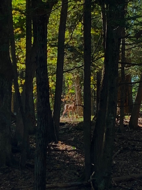 Walking through the woods, I spy a doe in a clearing off in the distance. I’m looking at her, she’s looking at me. I try not to move and we just stare at each other for a while. They are pretty bold lately. She doesn’t take off. I leave first and she goes back to her business at hand.