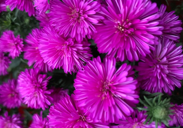 The allure of the asters on the porch have become a gathering place for the bumble bees during the warmer hours of the day. The flowers are alive with their movement. They aren’t holding still long enough so I can catch a good photo, but their bright yellow and deep black bodies against the violet/pink of the blooms are beautiful to watch. The queen bumble bee will hibernate and winter over. The rest of the colony will not last past the fall.