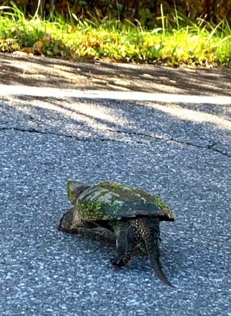 The colors are so vibrant right in my own back yard that it’s not really necessary to go for a foliage drive, but I decided to get into the mountains anyway in order to get the full vista. What looked like a lost piece of luggage on the pavement far up ahead turned out to be a fairly large snapping turtle slowly crossing the road. I was very relieved that the car I flagged down coming in the opposite direction noticed me waving and flashing and was able to stop. We both waited and held up traffic both ways until the snapper made it safely to the other side. The other driver was relieved and profusely thankful that I stopped her in time. I think we both felt pretty good about it.