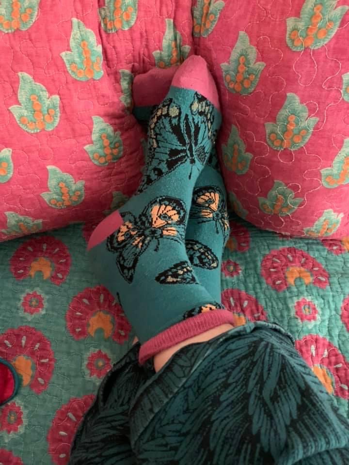 After such a positive response to the octopus socks, I decided to also photograph the pair I was wearing on he following day. They happened to be butterfly socks. As soon as I put them on, I knew these butterflies wanted to be resting on the turquoise and pink cover on the bed in my sewing room. So I walked in there, took a photo and posted it on my timeline again. It provided an odd, if minute, source of fun for a few friends; an easy, silly relief. Thus “Socks of the Day” was officially born.
