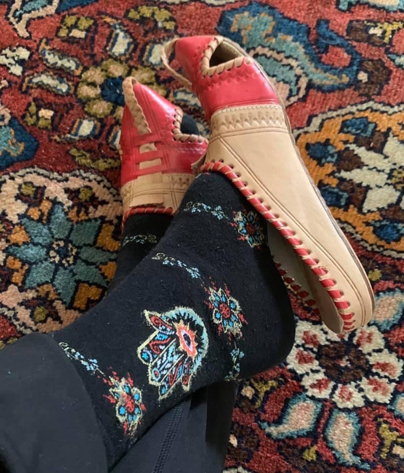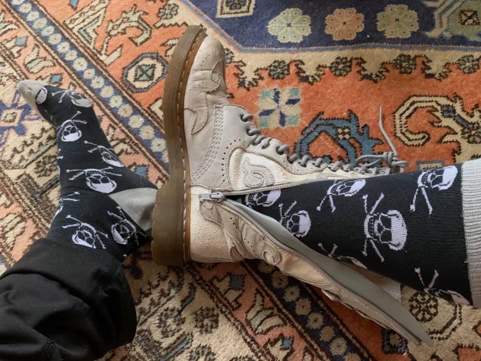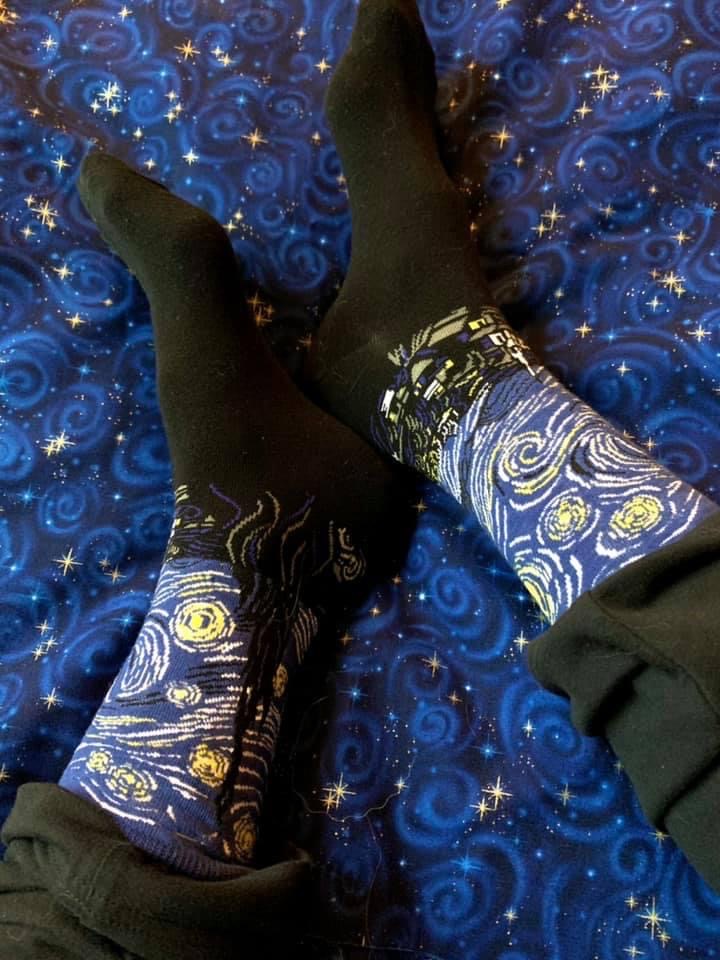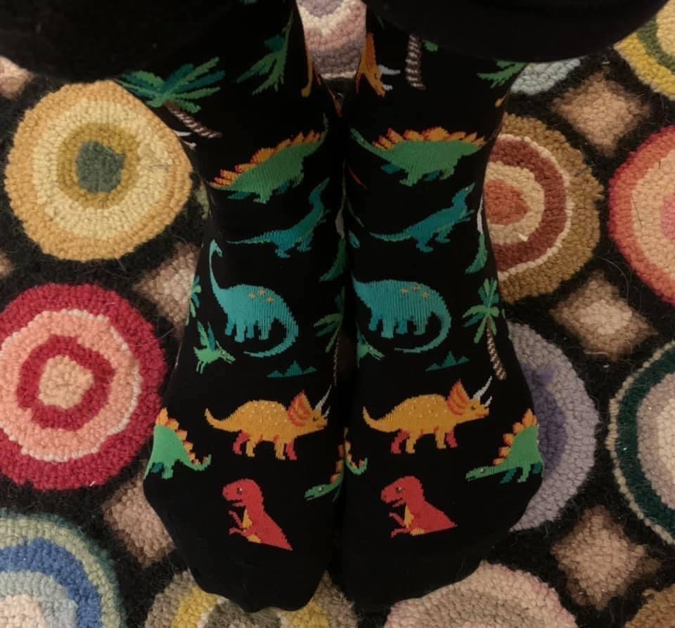 “Socks of the Day” was inadvertently born during the early days of the pandemic – that time of fear and uncertainty, when the roads and neighborhoods were suddenly empty of traffic and life, people scurrying to opposite sides of the street in order to avoid each other. The news we were glued to was filled with grimness and foreboding. Toilet paper, alcohol and cleaning supplies were being hoarded. We became shut-ins, or at least as shut-in as we were able to. Any redirection from this great heaviness seemed a welcome distraction.