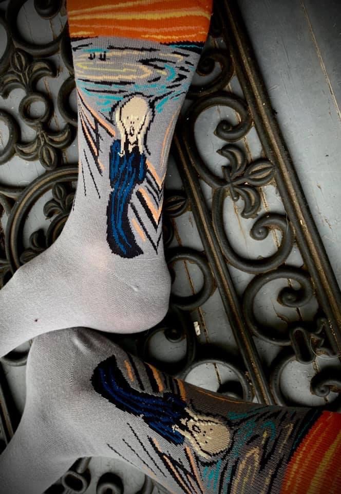 As this continued, people became more entertained, amused, incredulous. I became all of those things too. “The Scream” was a metaphor which embodied the current state of the world, generating comments like “Socks of the Year”, “Pandemic Perfection” and “How appropriate”. Men and women alike were enjoying the socks. It became both pleasurable and challenging to continue to accommodate. Rocking the socks……