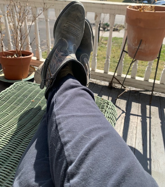 The other day Rudi Dog and I spent a little while sitting out on the porch wicker chairs, basking in some surprisingly warm afternoon sun. I haven’t taken the chair cushions out yet and gotten into the full porch-hanging mode, but soon…..