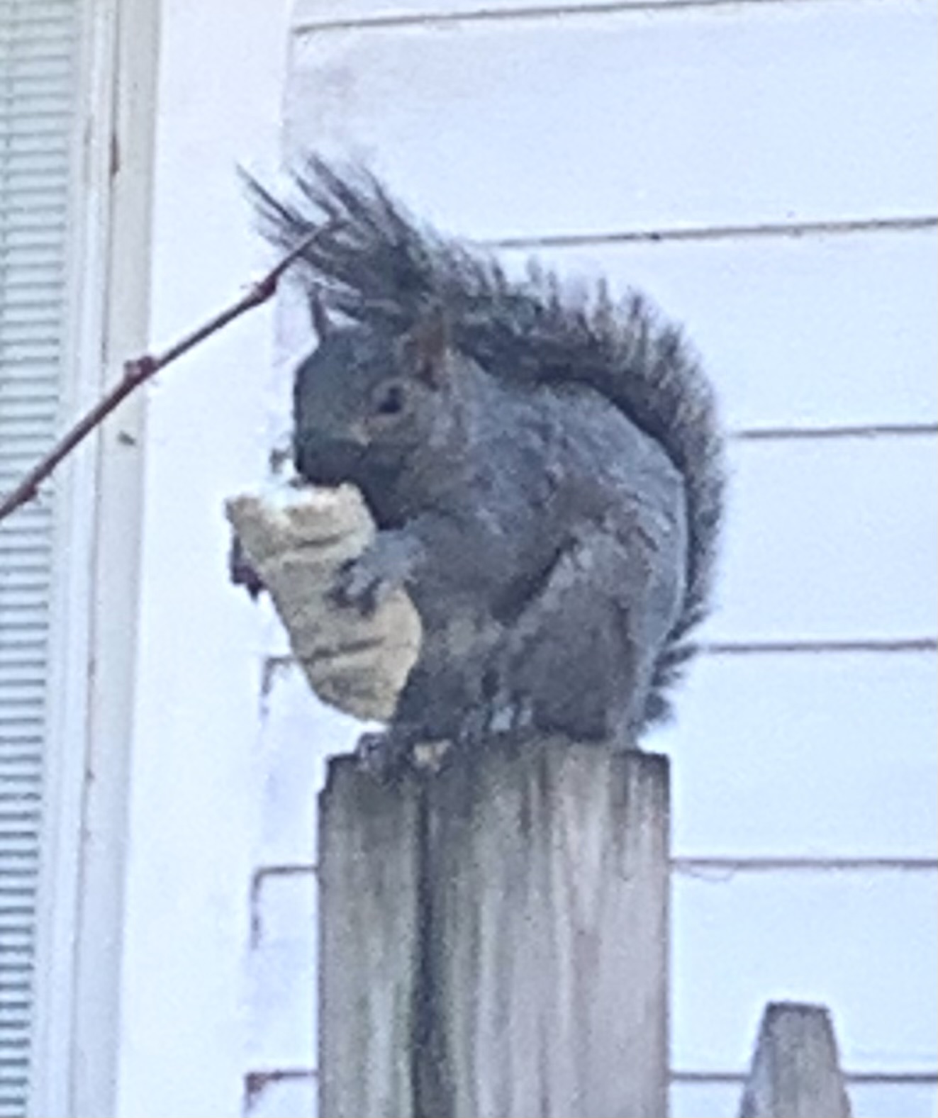 Over the past couple of days I have been outside doing a bit of spring yard work, raking the leaves out of the garden beds that had been left as mulch and protection over the winter. There are many whole peanuts stashed between stones and under the steps. While raking, I looked up to see a squirrel perched on the fence post with what looked like part of a baguette in its paws, eating with great concentration. Oddly (and amusingly) enough, the high frequency sound of the squirrel-nibbling happened to also be in my hearing range. As a matter of fact, that is just about all I could hear – small, insistent crunching. I was standing pretty close to the squirrel, who was so busy enjoying his score that he didn’t immediately pay attention to me. Given the proximity, I should have been able to get a very clear photo of him…..instead, it is also out of focus.