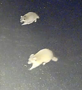 Last night there were two racoons hanging out together in the yard – I think it is long tail and stumpy tail again. Now that the garbage two houses down is being hauled away, it is possible they are looking for other pickings. The fox has not been sighted since the first viewing, but the mostly all white skunk has returned for the night, and the opossum is back too. There are also a pair of black and white cats hanging around, possibly feral, which appear to be left behind after The Eviction.
