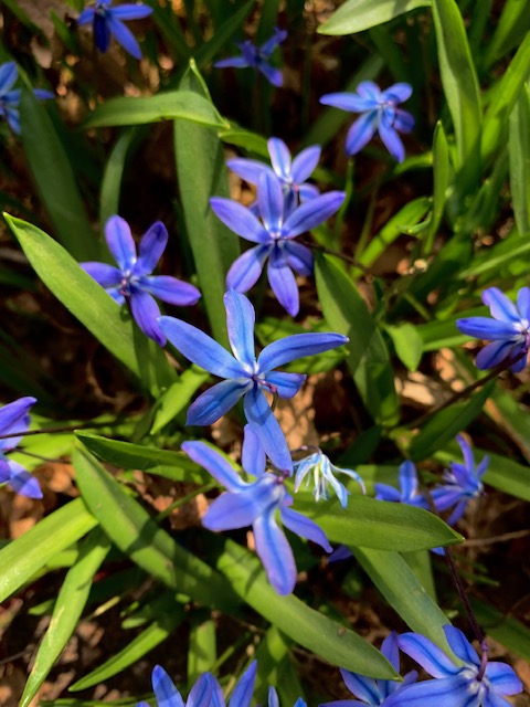 The daffodils are in full, showy array. Beautiful blue Scilla – always a favorite, which evokes memories of a lawn carpeted with them at a shared hippie-house back in the days of youth – is spreading through the back yard and along the bluestone path.