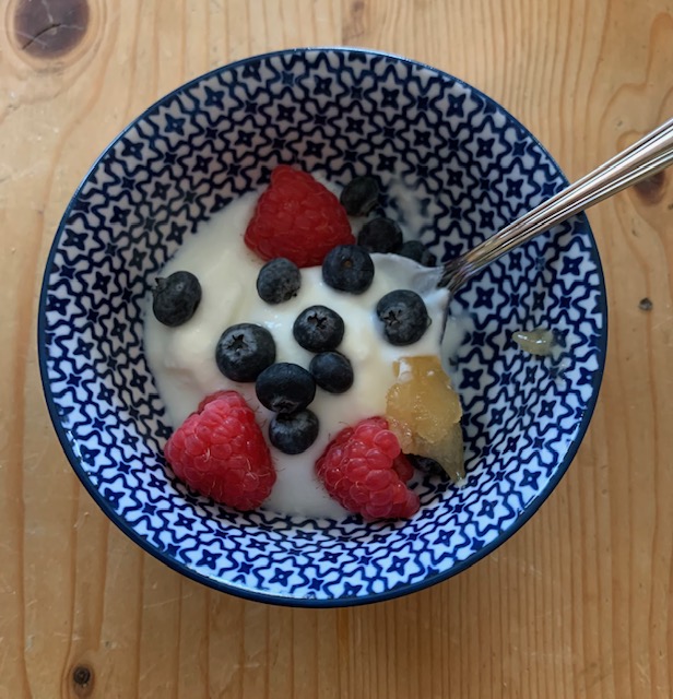 I’ve been making homemade yogurt. Years ago, my friend Emrose’s mother gave me her old Salton yogurt making machine, so yogurt was a regular process going on in the kitchen when the kids were small. The machine eventually disappeared – I can’t recall why. All these decades later the yogurt bug has bitten again and I put the word out for a used machine. Don’t you know I was given not one, but two used yogurt makers on the same day! Go figure! One of them is almost identical to the one I had. So far I have made yogurt twice in the slightly newer of the two models and am totally enjoying it. I haven’t tried making any in the second one yet to see if there is a difference. There really is no need to hang on to two of them (see Machine Age concerning my anxiety about the glut of useful household machines here). I may just pass one of the yogurt makers on, if anyone is interested. I will say there is something satisfying about having homemade yogurt with berries that were picked with a friend last summer and frozen, with a small spoon of honey from my brother’s bees mixed in. Some of the leftover homemade granola would probably be a nice addition to round it all out. Maybe tomorrow morning…