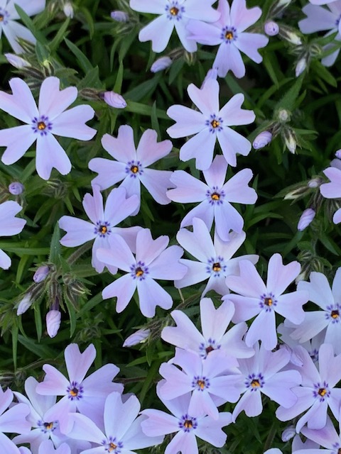 Boom! Clusters of Grape Hyacinth carpet the borders in purple and blue, all along the house and around the trees.