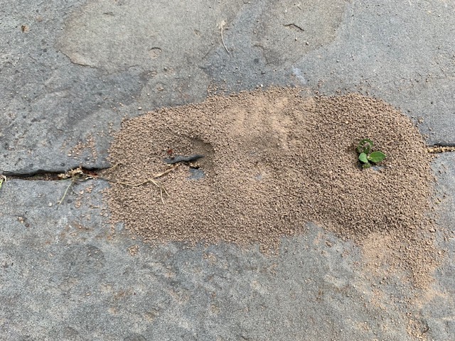 A ladybug landed on my hand today. Down on the sidewalk, the ants have been busy making their underground homes, leaving round little anthills in the strips between the bluestone slabs.