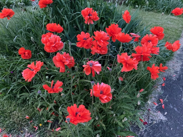 The poppies on the corner finally did flourish – not as impressive a show as last year, but still enough to stop foot traffic and attract admiration. Almost finished now, they still glow at dawn’s light and again at sunset, later becoming illuminated by the streetlights at night, their heads nodding neon-like in the dark. As the poppies make their final bows, the Irises enter the stage. First to bloom are the large, pale purple ones.