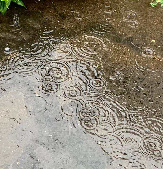 When light drizzle turned to steady rain, that became the opportunity to hunker down inside with a good book and some chocolate. At one point I took Rudi out for a quick walk, where we both got a bit wet walking through puddles of concentric raindrops that appeared on the sidewalk in front of the house.