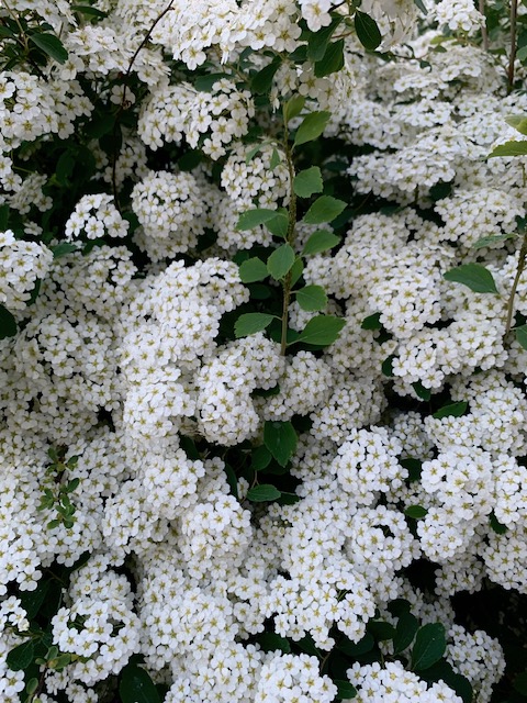 Across the street in front of a large Victorian house there is an unusually heavy showing of white Spirea, glowing, billowing flower clouds which surround two sides of the home. I caught a photo of them just before they edged past peak.