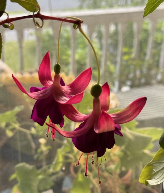 A glimpse of twin Fuchsia flowers dance just inside the porch window but don’t last long before dropping off. This tiny plant has managed to thrive on neglect over the past year. Historically I have never been able to make my Fuchsias last. They always seem to get infested with aphids. Perhaps those little ladybug larvae monsters could remedy that problem! I hope there will be more blooms.