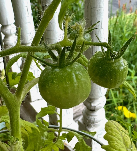Small tomatoes have emerged in the pots.