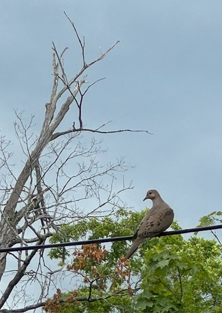 A Mourning Dove sits on the wire above the bird feeder next door, waiting patiently for the bully sparrows to give it a chance at some spilled seeds.