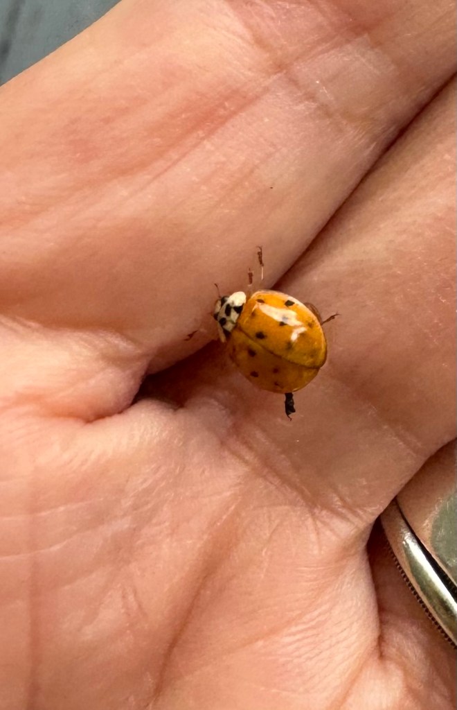 Tiny black and red ladybug larvae have appeared on the porch over the last couple of weeks, alighting on a flower pot, landing on my hand or lap as I sit outside sipping iced tea. They look like little monsters – I had to do some checking to figure out exactly what they were. I don’t recall seeing any last year, but have encountered plenty this month. Apparently they eat aphids, so they are a good thing.