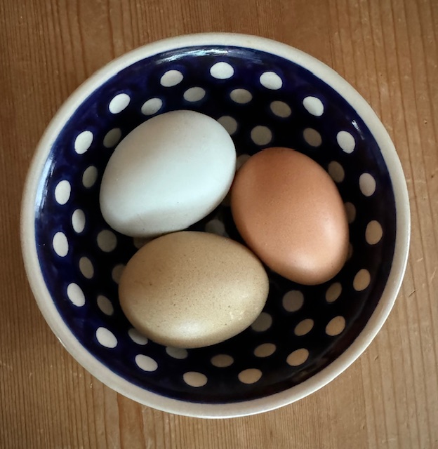 The hens are laying. Neighbors leave fresh eggs on the doorstep.
