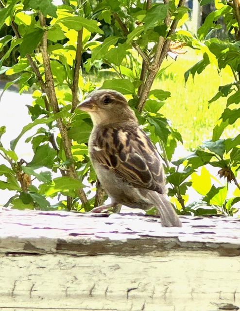 Emboldened House Sparrows dive, perch and continually chatter on and around the porch.
