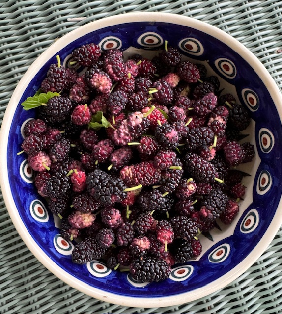 The mulberry trees are dropping great quantities of berries. I wasn’t going to bother with them this year, but while walking by the tree, I was overcome with the sudden urge to gather some for breakfast tomorrow.