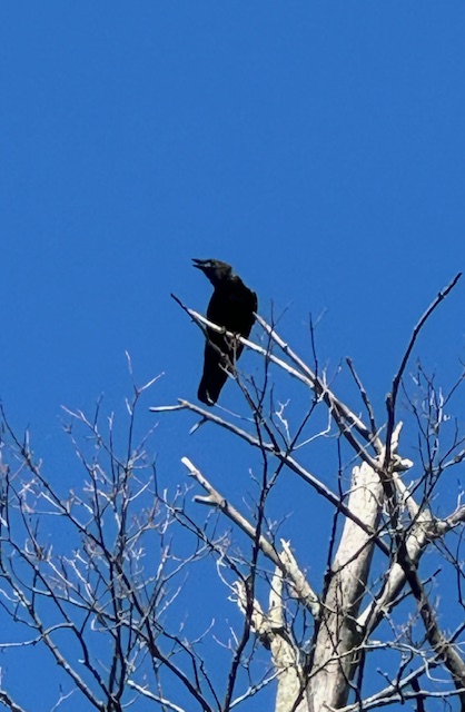 High up in the crow tree, my crow friend calls out from a Hydrangea-colored sky.