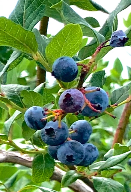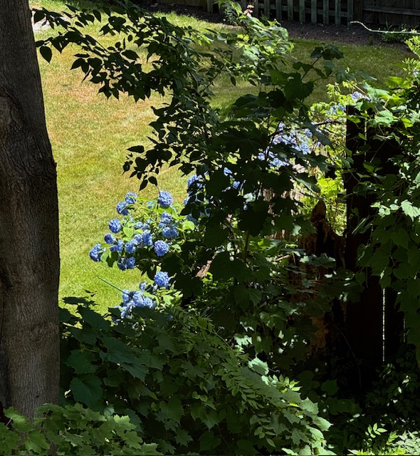 Although the view of the pond is currently hidden by a canopy of leaves, something blue along our shared back fence caught my eye. Could that be a Hydrangea? I had no idea there was a Hydrangea back there at all. I’m guessing it had never gotten large enough or made enough of a show to be seen from my perspective.